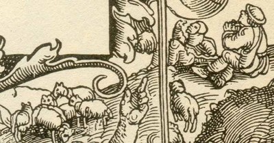To hyrder med deres får. Detalje fra titelbladet på Christian 3.s bibel (1550)